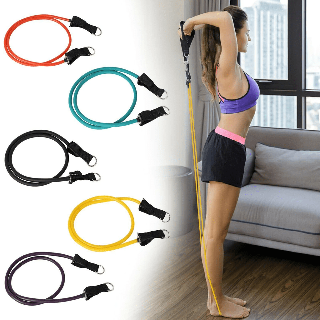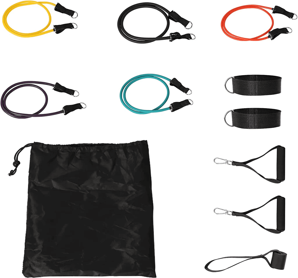11 Pack: Included 5 resistance bands; 1 door anchor; 2 handles; 2 leg ankle straps; 1 carry bag.