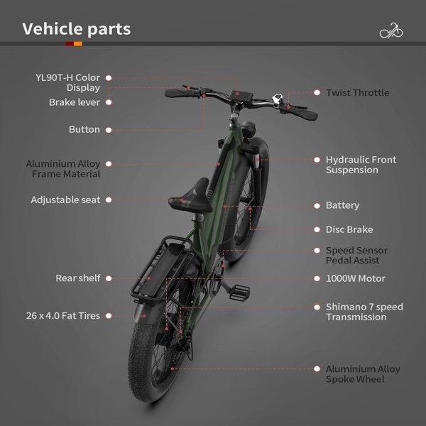 Brand: AOSTIRMOTOR Model: KING Color: Dark Green Frame: 6061 Aluminum Alloy Rim Material: Aluminum Alloy Motor: 1000W Motor Controller: 52V 30A Display: Color-LCD Turn-Handle: Rotary Lithium Cell Capacity: 52V 15Ah lithium battery Charging Time: 4-6 hours (Recharge regularly to extend the life of lithium cell) Fork:Front suspension fork Rear Rack: With Brake: F/R HYDRAULIC Brake (With 4pcs Brake Pads) Disc Brake:Front 180 & Rear 160 Brake Lever: Universal Rim Form: Spoke Wheel Tire: 26x4.0 inch Fat Tire Throttle: With Front Suspension: Fork shock absorption Rear Suspension: NO Structure Shock Absorption:Lightweight Aluminum Alloy Frame Light: With Front light Pedal: Universal Footrest: Universal Riding Mode:Pedal Mode / Boost Mode / Power Mode Range Distance:30-45 km (Pure Power-Mode) Max Speed: 50km/h Tube Clamp: D1=30mm D2=38mm Handlebar Size: 31.8*680mm Stem Size: 31.8*80mm Weight Capacity: 300lb