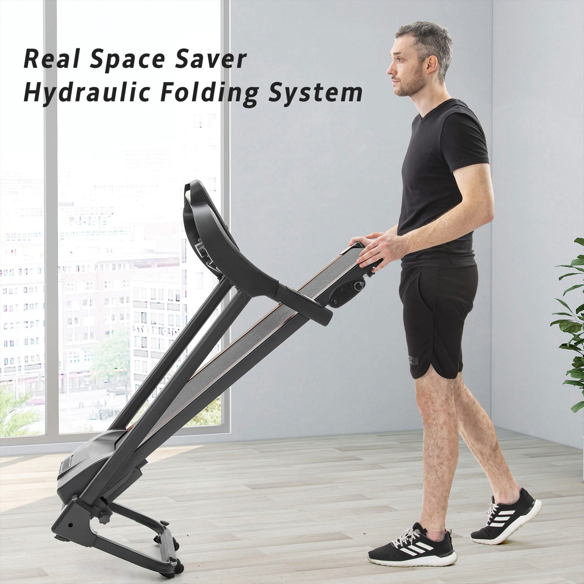 Compact Easy Folding Treadmill Motorized Running Jogging Machine with Audio Speakers and Incline Adjuster· [0-7.5 MPH Speed Adjuster] Go from 0.8 – 12 KM/H (0.5 to 7.5MPH) within seconds using the speed adjuster allowing you to seamlessly transition from light warm-up to a run.· [Quality 4-Layer Running Belt] Features PVC diamond tread outer layer that resists wear 2 mesh layers and a PVC layer for shock absorption and a smooth comfortable run.· [Customize Your Workout] Large LCD display and hand pulse sensor help track your real-time progress in speed, distance, time, calories and heart rate. 3 adjustable incline options and 12 built-in workout programs help you exercise more efficiently. · Product Dimensions: 50.5' x 23.7' x 45'. Folded Size: 26.5' x 23.7' x 49'. Running Surface: 15.5' x 41.5'Bring the outdoors into the comfort of your own home with this compact treadmill, a great option to workout indoors and hold yourself accountable to meeting or maintaining workout goals. Complete with a compact design, this Treadmill has a small footprint that's perfect for apartments or at-home gyms that are low on space with its easy-storage folding mechanism, allowing users the option to quickly fold it up and out of the way to conserve valuable space in your home when needed. Sleek in design, this treadmill is built with high-grade sourced materials to closely mirror the average treadmill you see at your local gym, without the hefty price tag. Kick your cardio into high gear with the 12 built in running programs and 3 incline options that will help keep your workout interesting, and a robust 1.5HP motor capable of taking your treadmill from 0.8 – 12 KM/H (0.5 to 7.5MPH) in seconds to accommodate light warmups and brisk running. SPECIFICATIONSColorBlackMaterialFrame: SteelPanel: PlasticSpeed0.5-7.5 mphMotor1.5 HPTraining Programs12 ProgramsFoldableYesPhone/Pad HolderYesMultimediaAudio auxiliary port with dual speakersTransportation RollersYesIncline3-Level Manual InclineDisplayTime, speed, distance, calories, pulse rateHeart Rate PulseHeart rate sensors on handrailsRunning Area/Tread Belt41.5" x 15.5"Assembled Size (L x W x H)50.5" x 23.7" x 45" Folded Size (L x W x H)26.5" x 23.7" x 49"Max. User Weight240 LBSProduct Weight73 LBSPackage Dimensions55" x 27" x 10"Package Weight86 LBSWarranty1-Year Limited WarrantyPower Supply110VAssemblyAssembly requiredToolsTools required during assembly are included in package