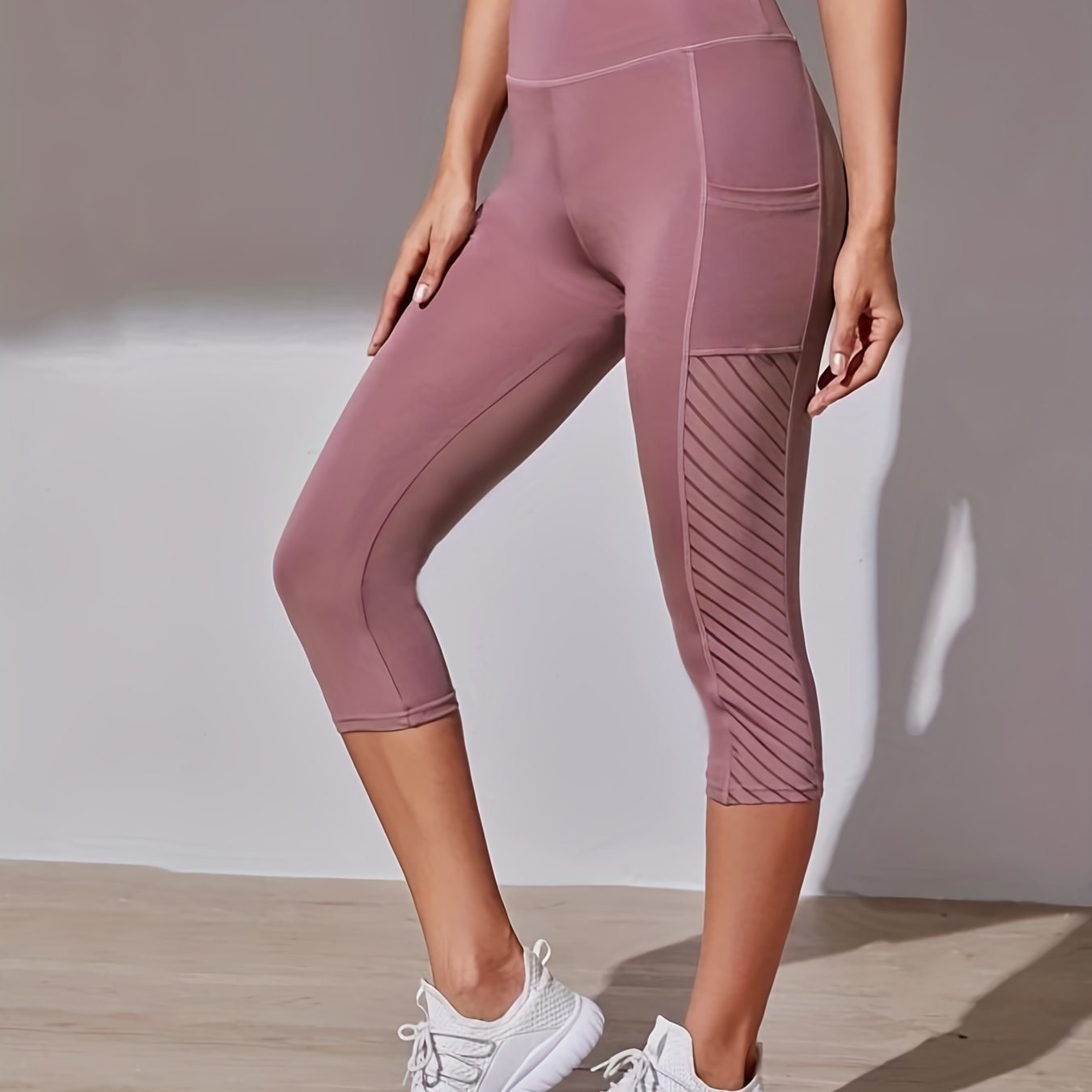 High Waist Yoga Capri Pants, Tummy Control Sports Legging Capri For Women With Out Pockets And Mesh Design - Pale Pinkish Gray - M(6)