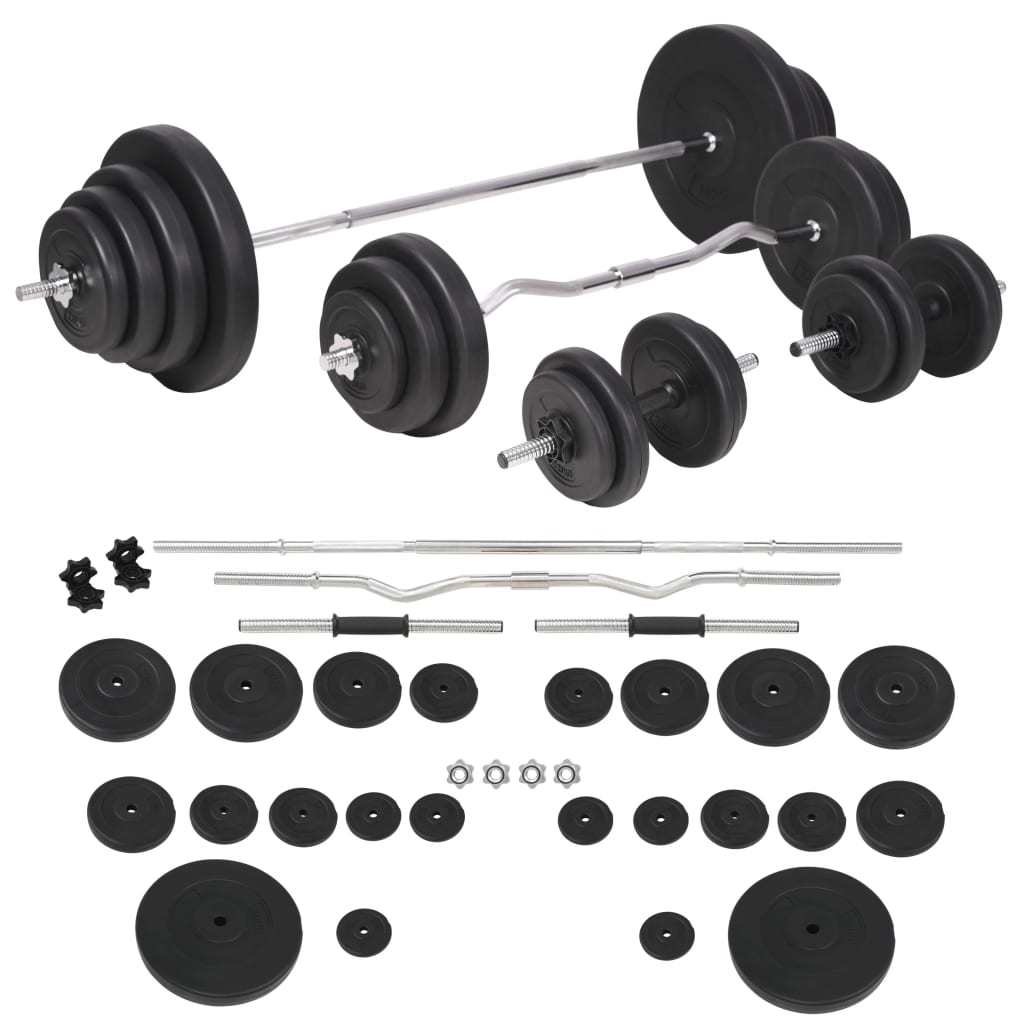 This versatile barbell and dumbbell set is perfect for chest, biceps, arms, triceps and back muscles. It includes two 33.1 lb plates, two 22 lb plates, two 16.5 lb plates, four 11 lb plates, six 5.5 lb plates, six 2.8 lb plates, two barbell bars and two dumbbell bars and has a total weight of about 264.6 lb.