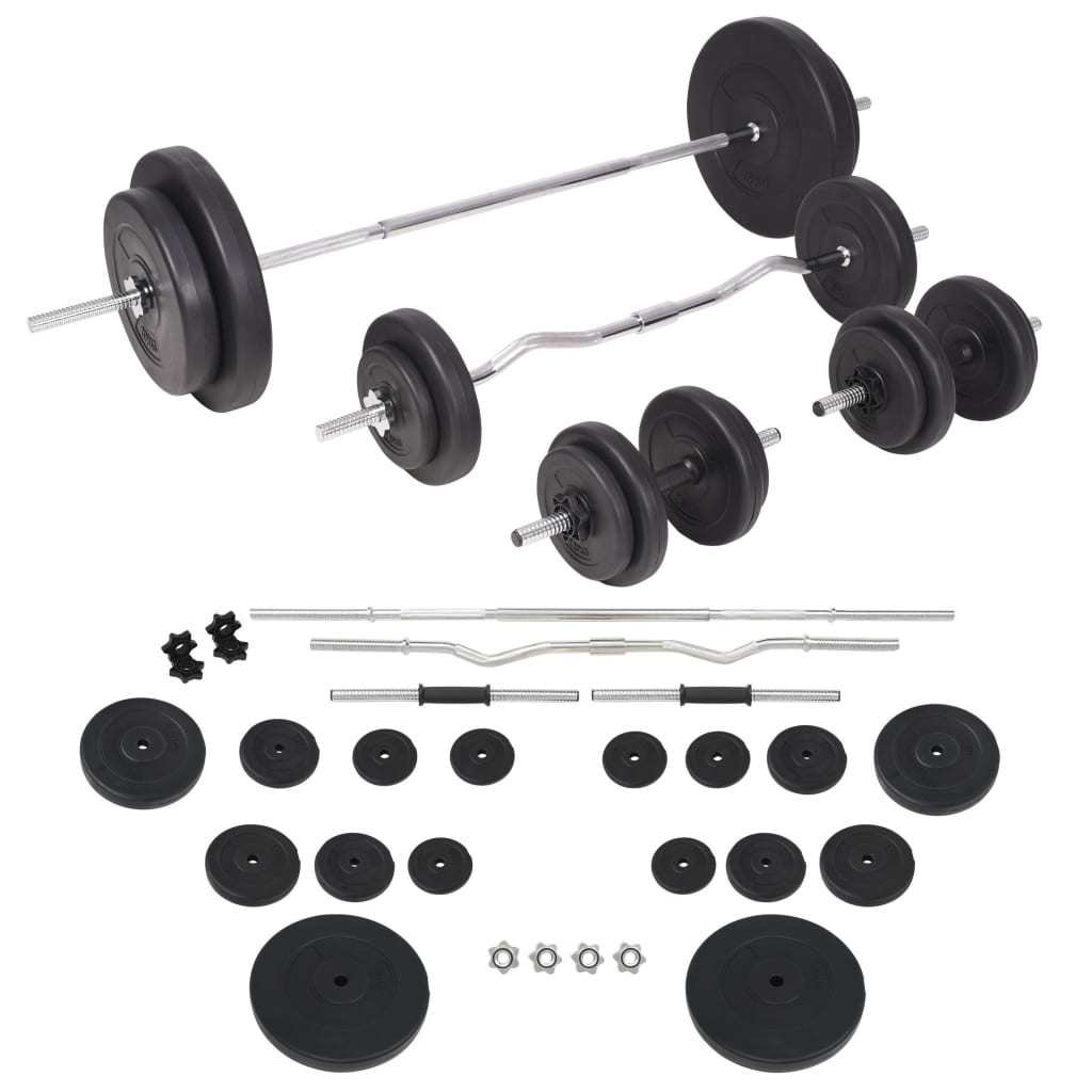 The versatile barbell and dumbbell set is perfect for chest, biceps, arms, triceps and back muscles. It includes two 33.1 lb plates, two 22 lb plates, two 11 lb plates, four 5.5 lb plates, six 2.8 lb plates, two barbell bars and two dumbbell bars and has a total weight of about 198.4 lb.